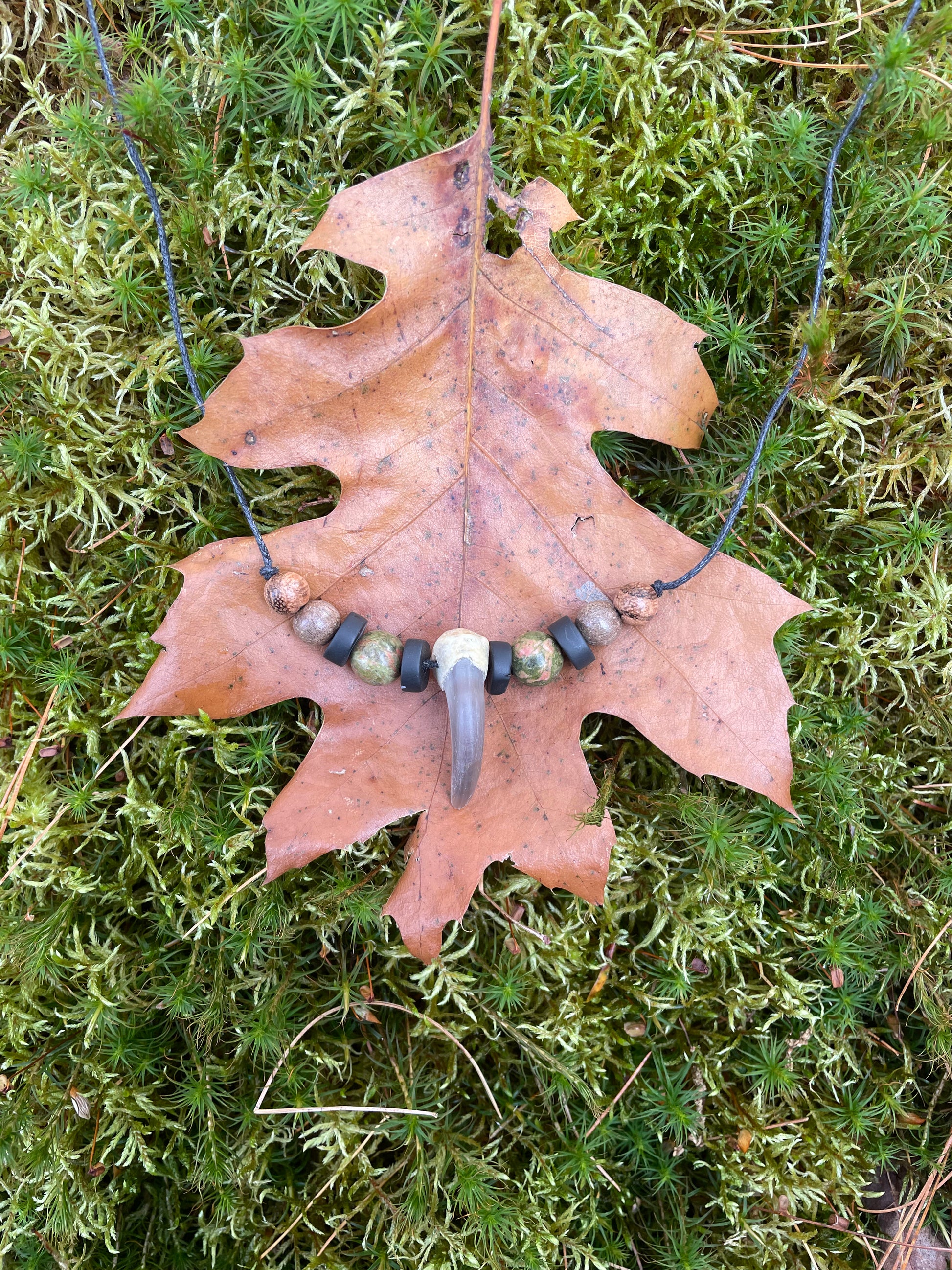 A black bear claw strung on black cord, honoring the great spirit of the black bear that watches over the Northeast of New England. This piece has been paired with grounding materia, matching the earthy spirit held within - beads of obsidian, unakite, wood, and sandalwood adorn this piece.
