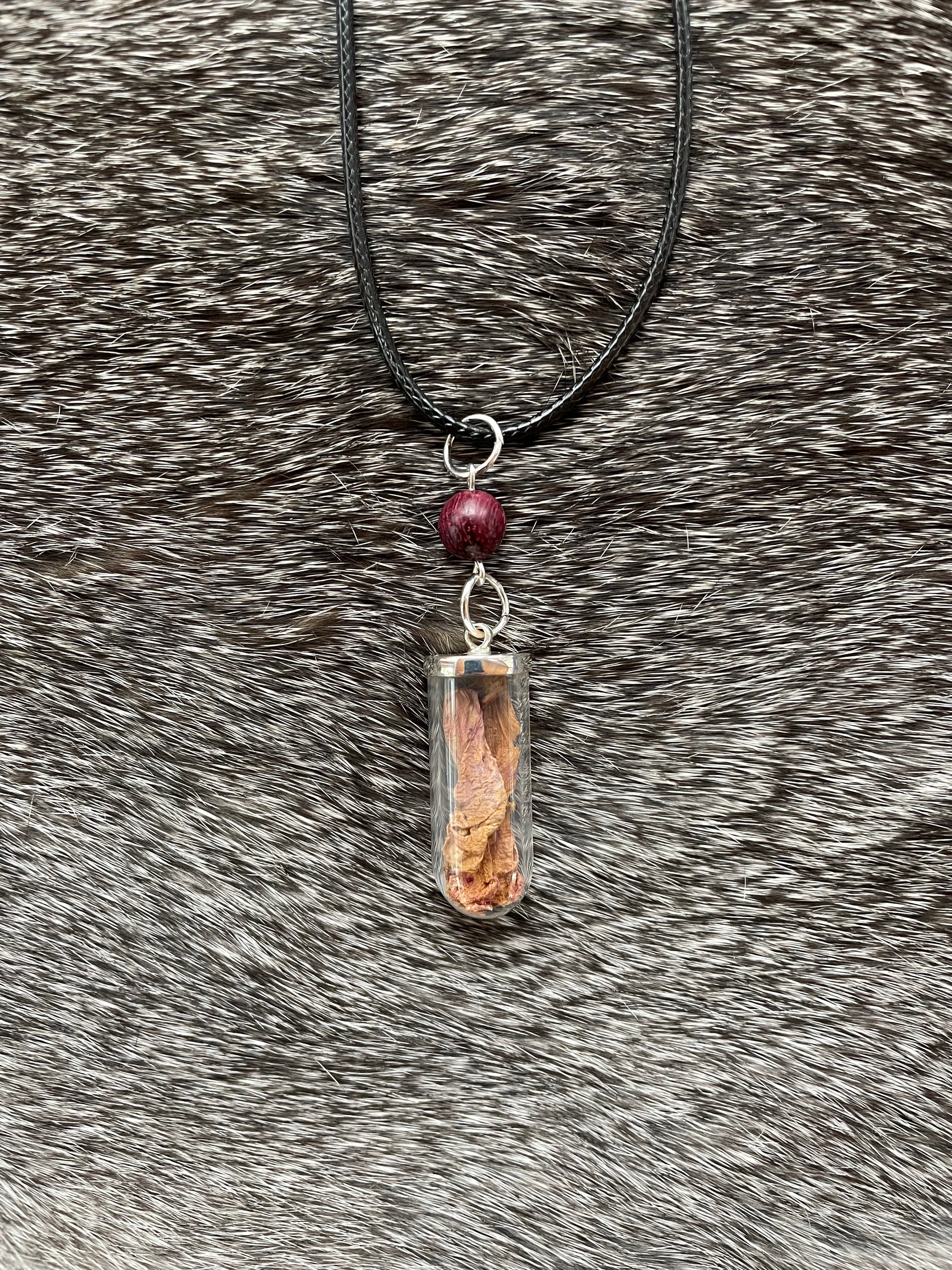 Digitalis flower in a glass vial with sterling silver fixtures, paired with a purple heartwood bead, and strung on black cotton cord.