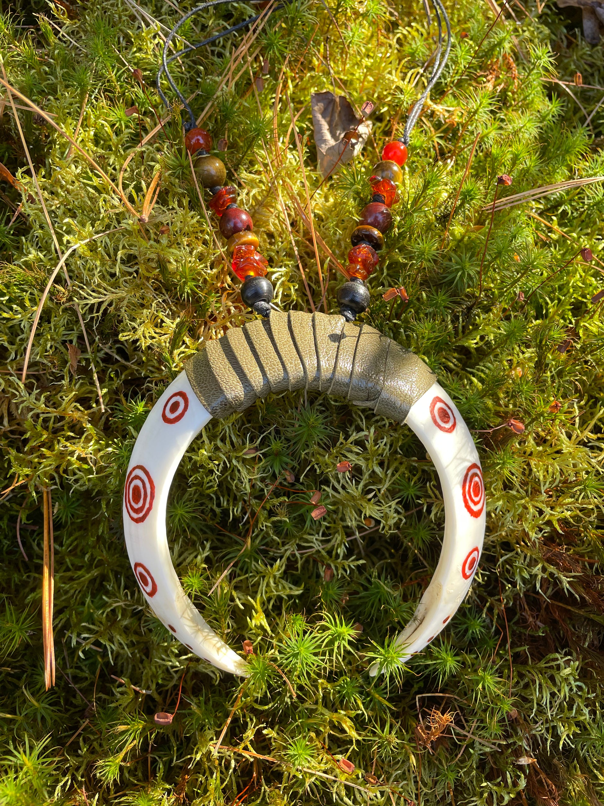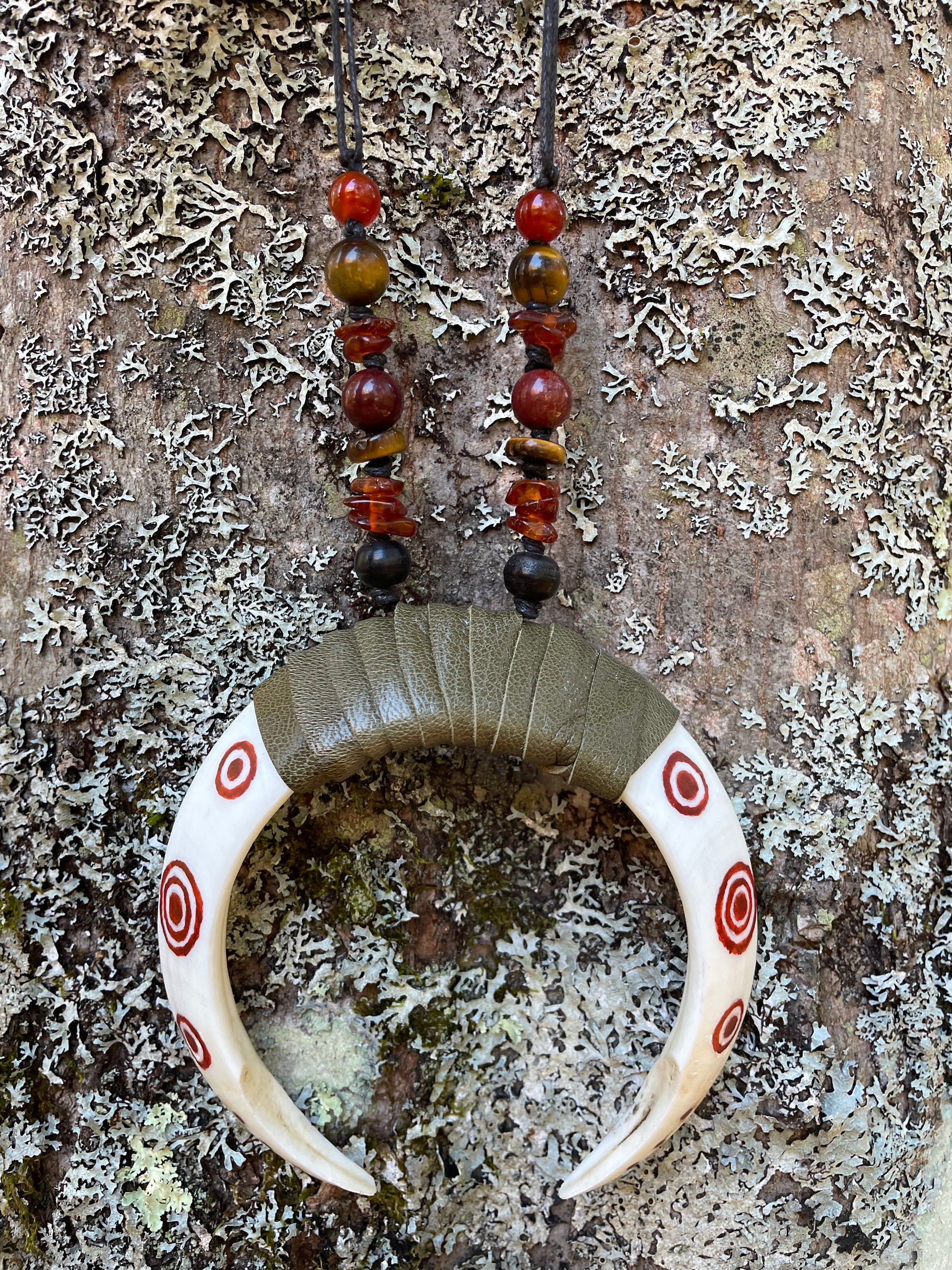 A ceremonial adornment made in honor of the Golden Lady, Freyja, fit for a devotee of the goddess. The pendant features two wild boar tusks that have been attached to form a lunula, a style of pendant worn by women during the Viking Age. Wrapped in green deer leather and strung upon durable cotton cord, this piece is adorned with beads of horn, Baltic amber, tiger's eye, jasper, and carnelian.